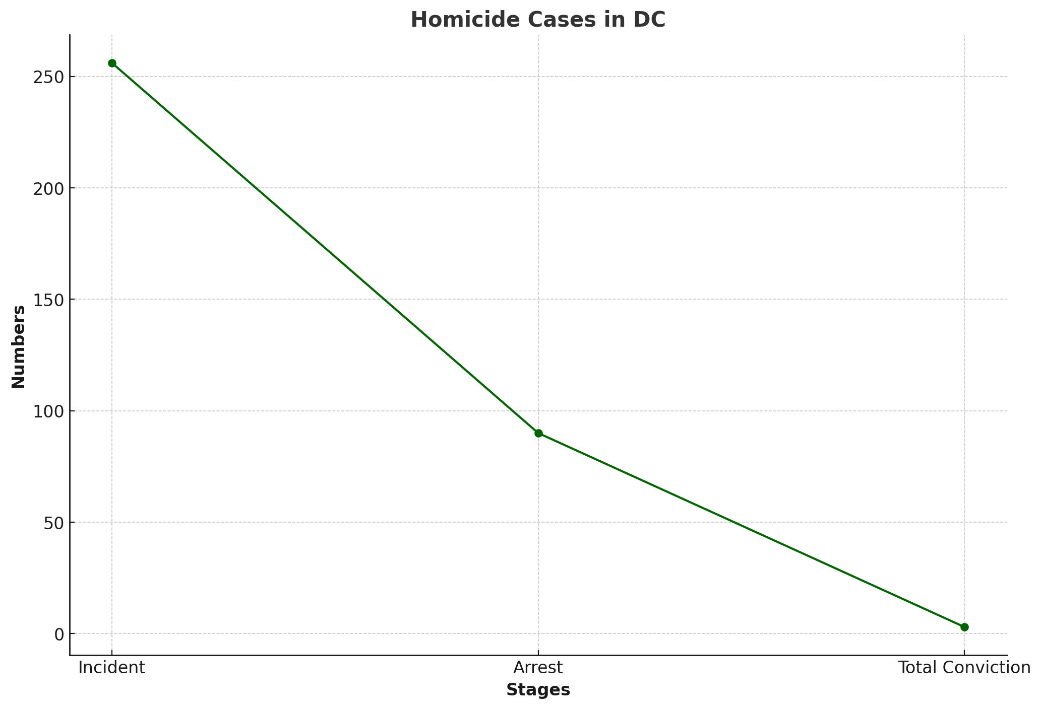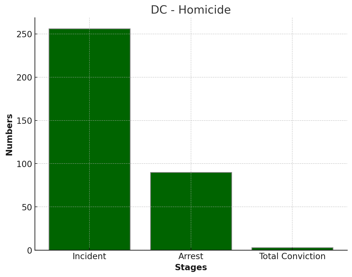 The graphs show that over 250 homicides occurred in DC in 2023, less than 100 individuals were arrested in connection to the incidents, and less than 50 were convicted.