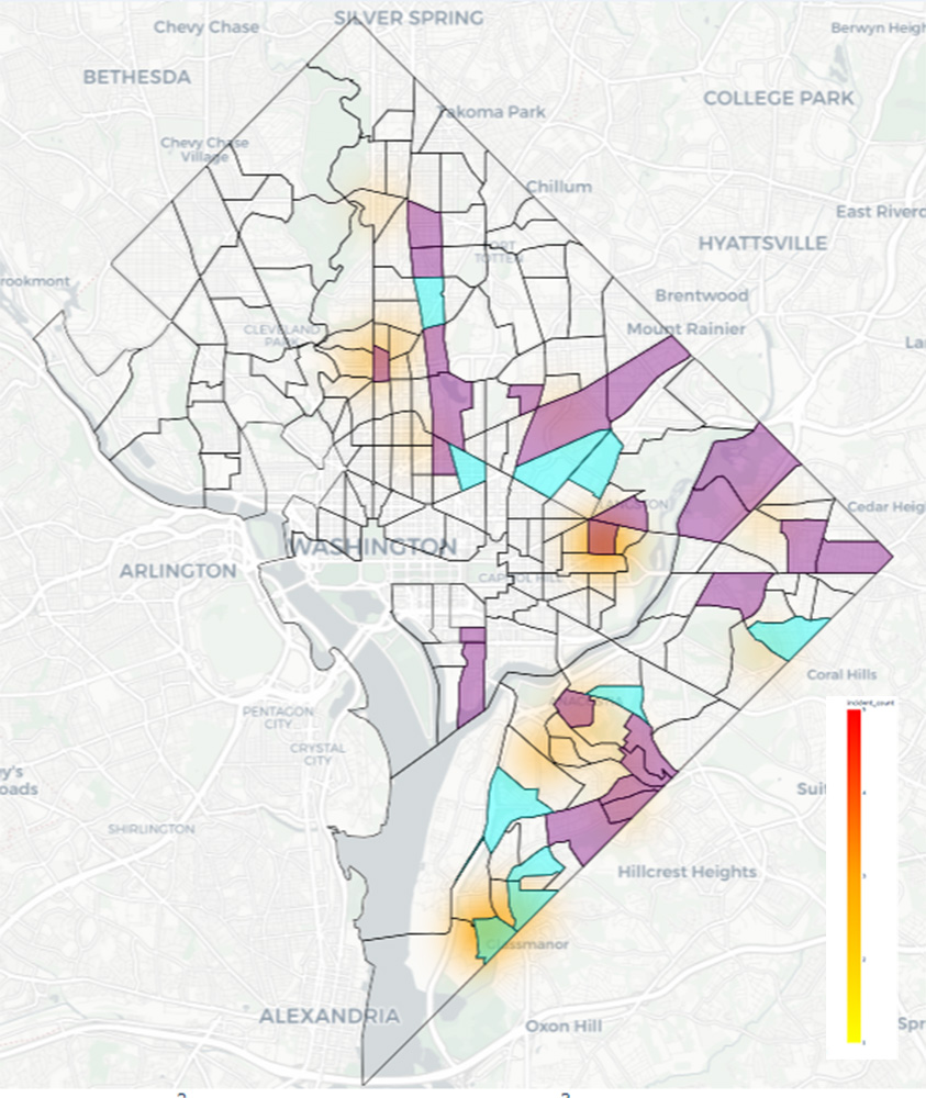 Priority Communities, represented by the purple areas in the map, is a violence interrupter program established by the Office of Neighborhood Safety and Engagement in 2018 that serves 27 communities in DC. According to D.C. Witness data, between June 2023 and June 2024 areas under Priority Communities had 26 homicides and 13 nonfatal shootings.