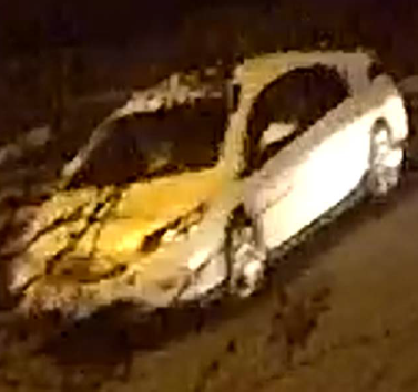 The vehicle is a a white Chevrolet Volt, with silver rims that is possibly missing a window on the driver’s side.