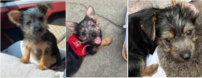 The puppy is a 12 week-old gold and black Yorkshire Terrier named Simba.
