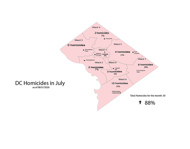 Thirty homicides occurred in Washington, DC during the month of July, an 88 percent increase from June.