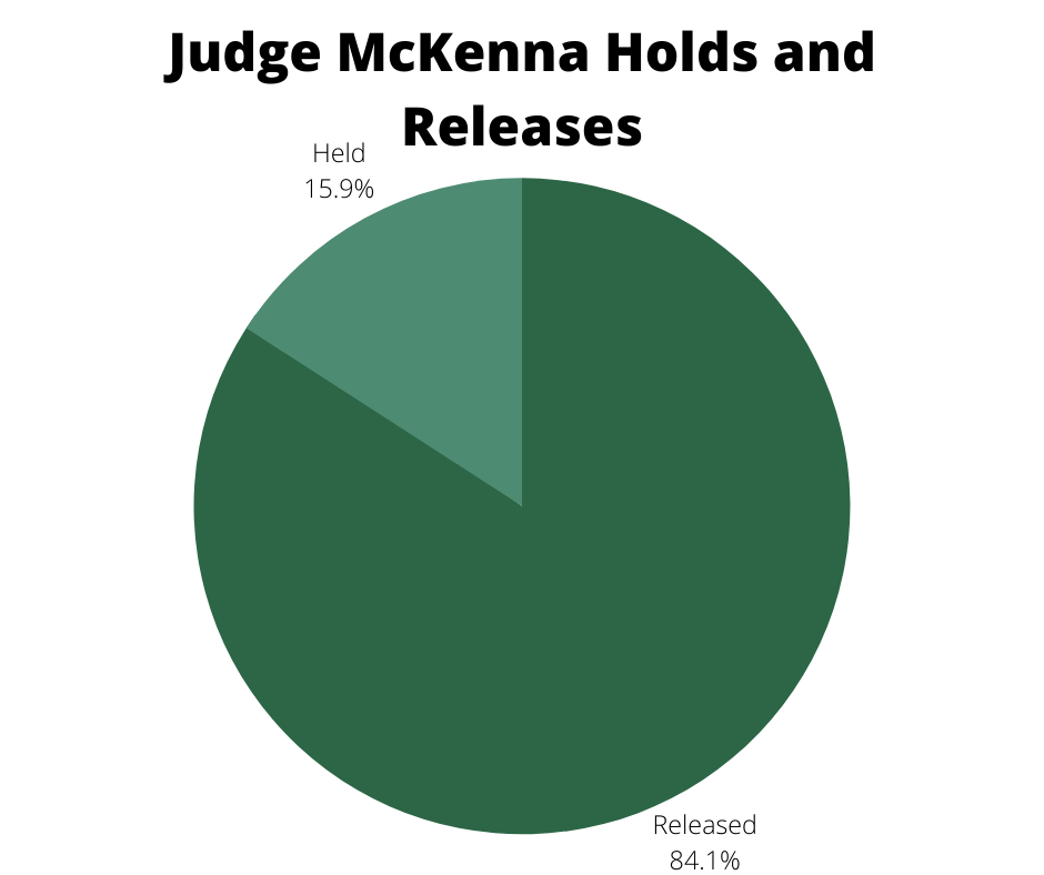 Judge Juliet McKenna held the lowest percentage of defendants, releasing just over 84 percent of all defendants and only holding around 16 percent. In total, she heard 63 cases during this time period.