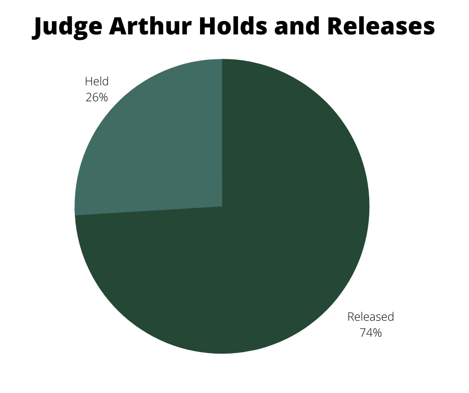 Of the four judges that presided over the hearings, Judge Errol Arthur held the highest percentage of defendants, 26 percent. He heard only 77 cases in total and held 20 of the defendants.