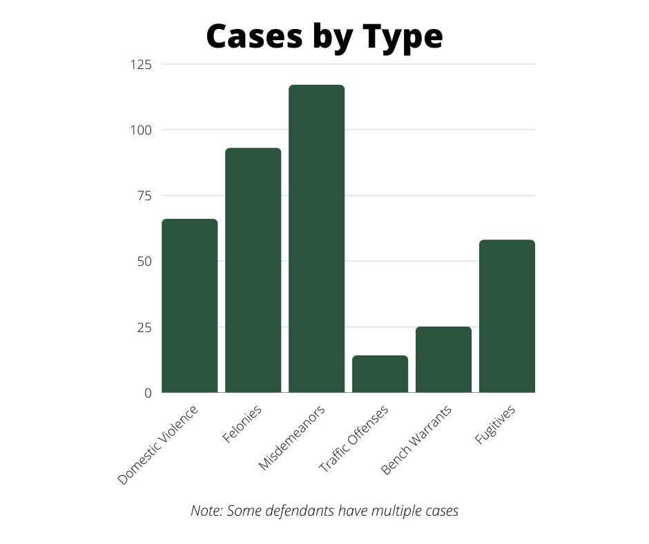 There were 66 domestic violence cases, 93 felony cases, 117 misdemeanor cases, 14 traffic cases, 58 fugitive cases and 25 bench warrant cases.