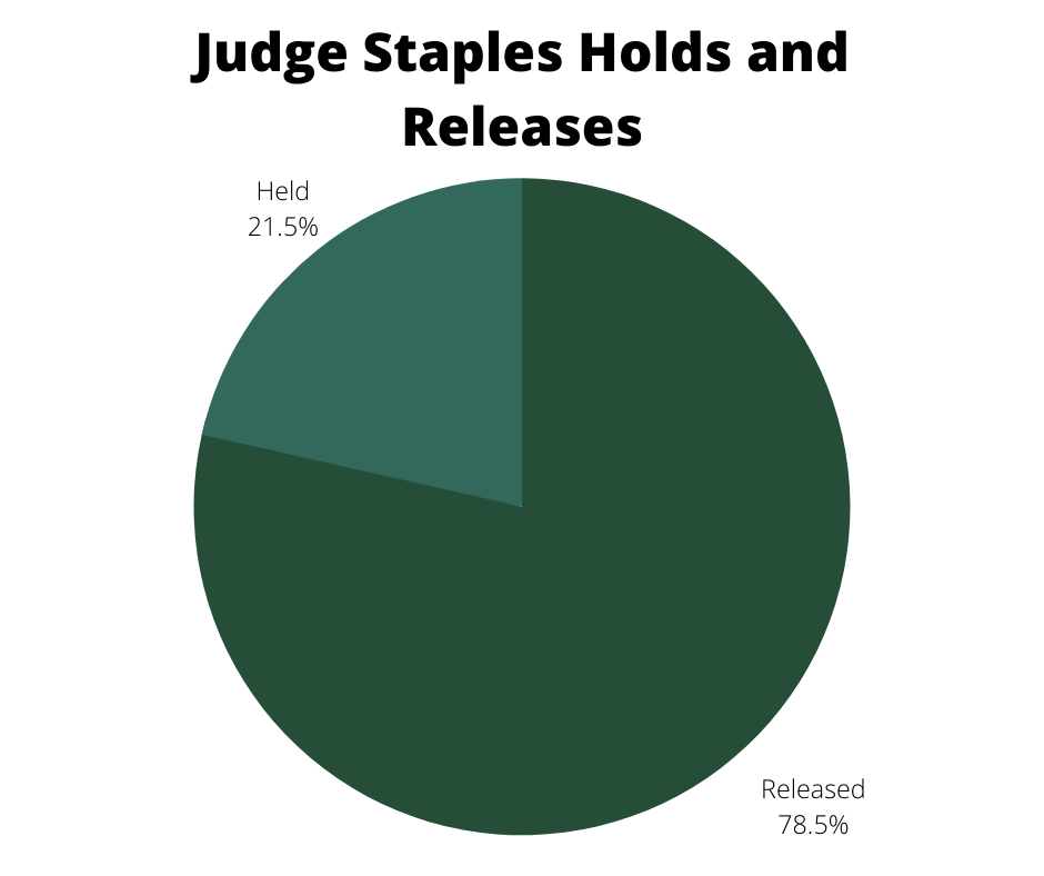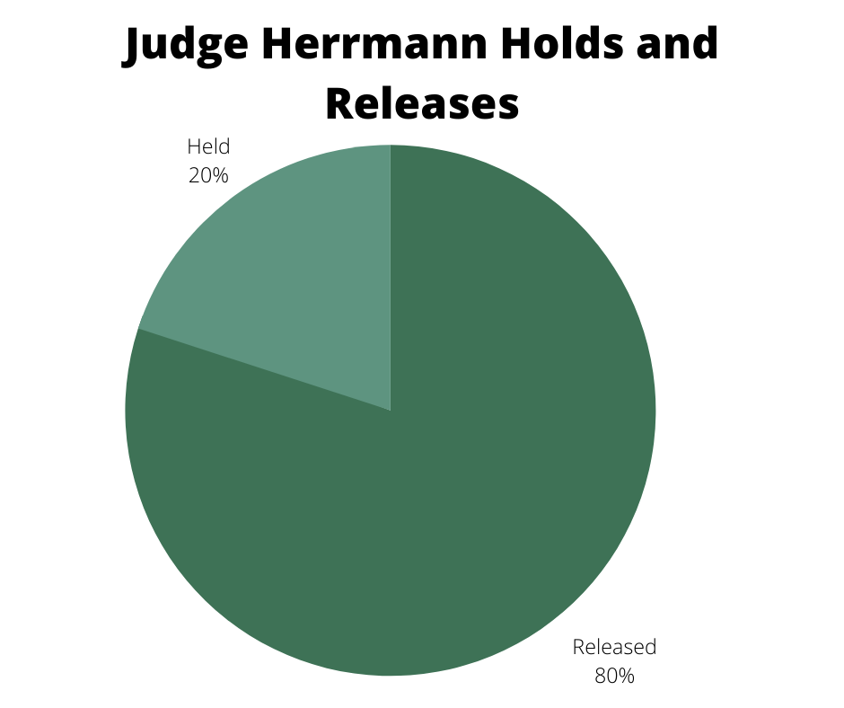 Judge Sean Staples and Judge Heide Herrmann held defendants at similar rates. Judge Staples presided over 163 cases, holding close to 22 percent and releasing around 78 percent. Judge Herrmann heard only 45 cases and held 20 percent, releasing 80 percent.
