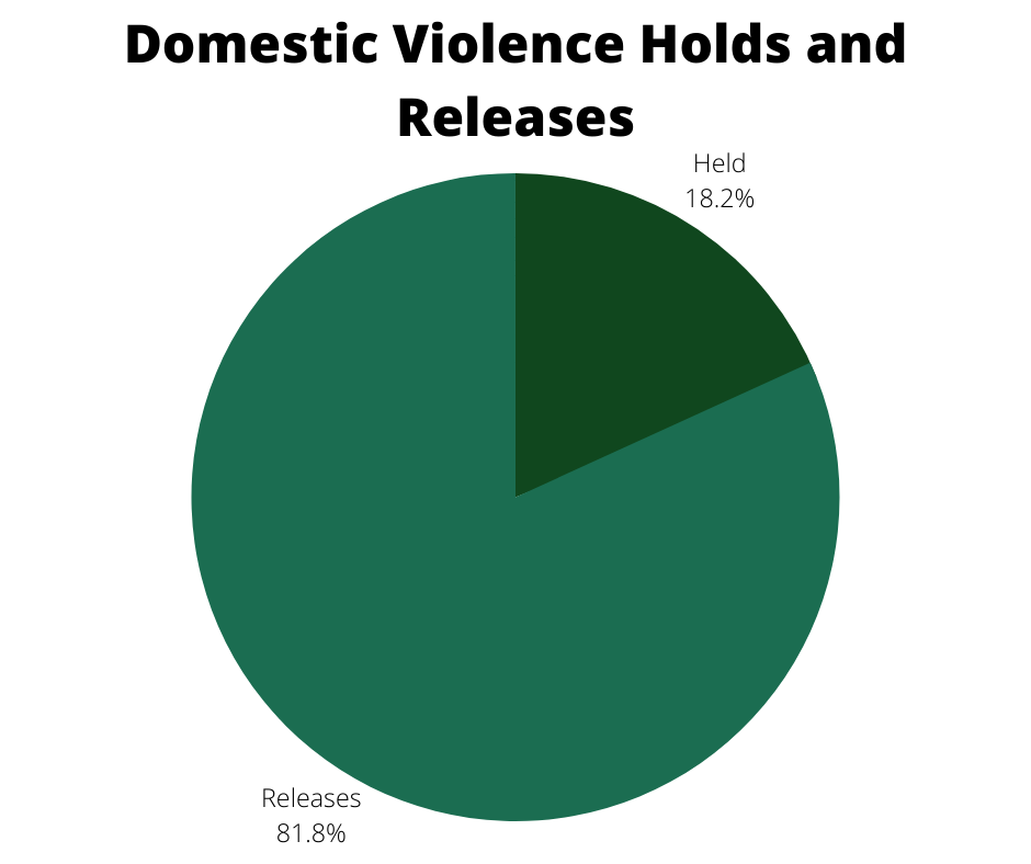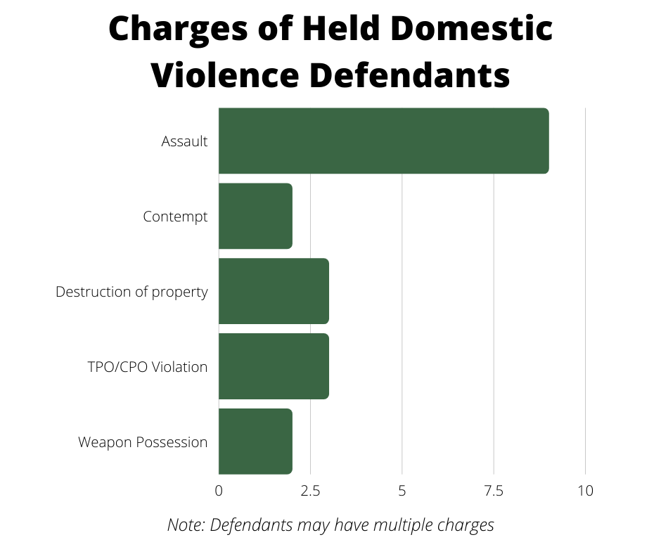 Charges for the domestic violence defendants who were held, included simple assault, contempt, destruction of property, violations of Temporary Protective Orders (TPO) or Civil Protective Orders (CPO) and weapon possession charges.