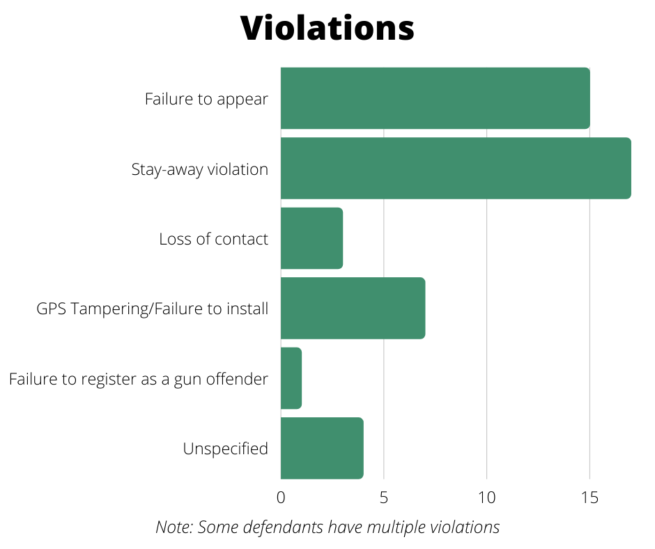 In all of the cases, judges mentioned at least 46 instances of violations, which occurred while defendants were either on pretrial release, probation or parole.