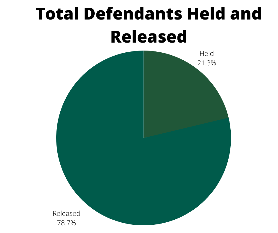 Overall, judges held around 21 percent of all defendants and released almost 79 percent of the defendants. Compared to the first half of October, judges held almost 5 percent less in the second half of October.