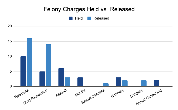 For the defendants held on felony charges, the largest number of charges also included weapons offenses. Assault charges were the second most common offense for felony holds, and judges did not release any defendants who were charged with murder or armed carjacking during that time.