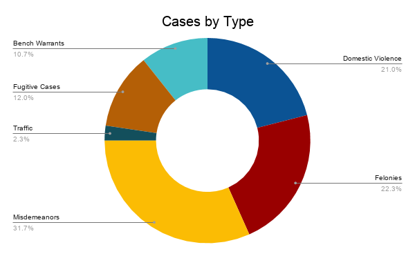 There were 67 felony cases, 63 domestic violence cases, 95 misdemeanor cases, seven traffic cases, 36 fugitive cases and 32 bench warrant matters. The majority of cases heard were misdemeanors, which is almost 32 percent of all cases.