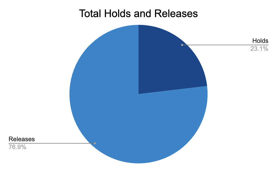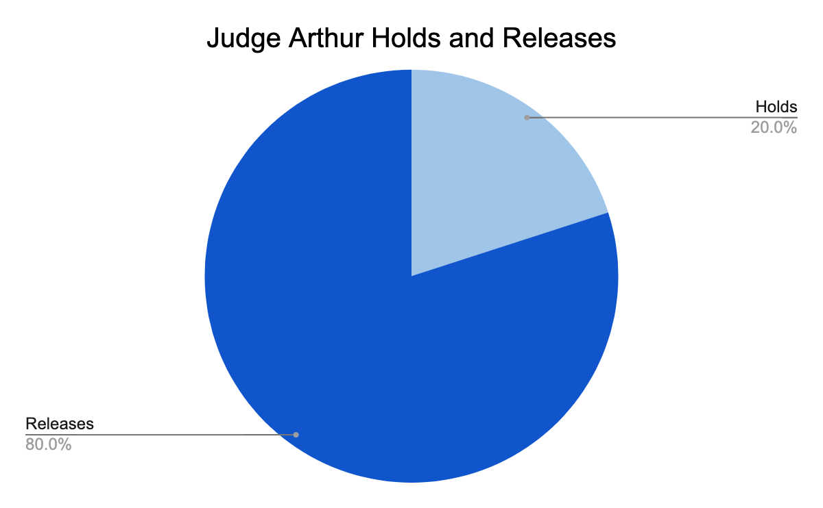Judge Errol Arthur was the third judge to preside over initial hearings. He held 20 percent of defendants and released 80 percent. There is only a 3 percent decrease in his releases compared to Judge McKenna.