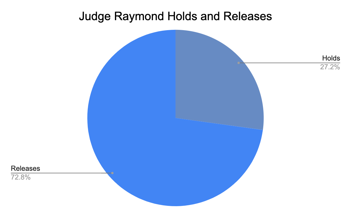 Judge Renee Raymond held 44 defendants and released 118. She held the highest percentage of defendants, nearly 37 percent compared to the two other judges who presided over initial hearings.