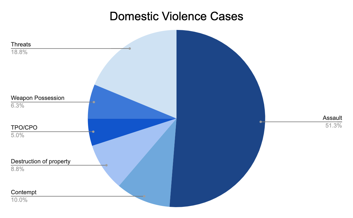 Domestic violence charges included assault, violating Temporary Protection Orders (TPO) and Civil Protection Orders (CPO), threats to do bodily harm, weapon possession, destruction of property and contempt. The majority of the defendants were charged with simple assault, which consists of almost 51 percent of all domestic violence cases.