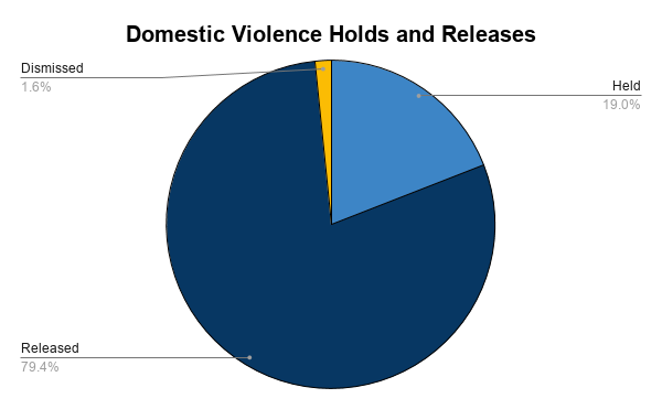 Of the 63 domestic violence cases, 12 of the defendants were held, 50 were released and one was dismissed by the prosecution.