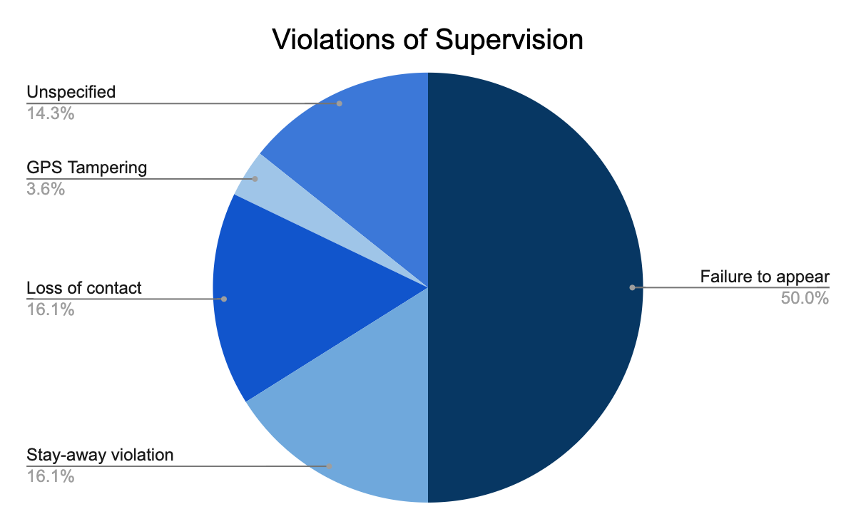 Some of the violations included failure to appear, stay-away violations, loss of contact, GPS tampering, while some were unspecified in court.