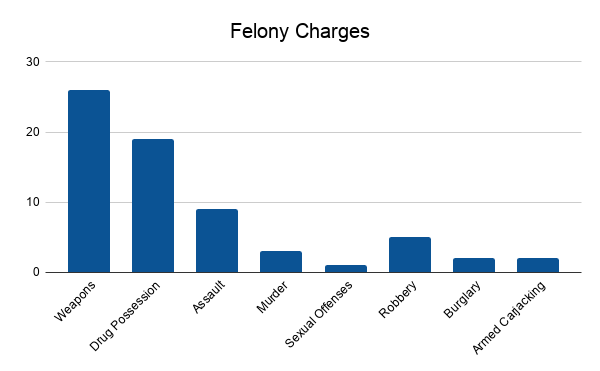 The majority of the felony charges included weapons with drug possession or distribution as a close second.