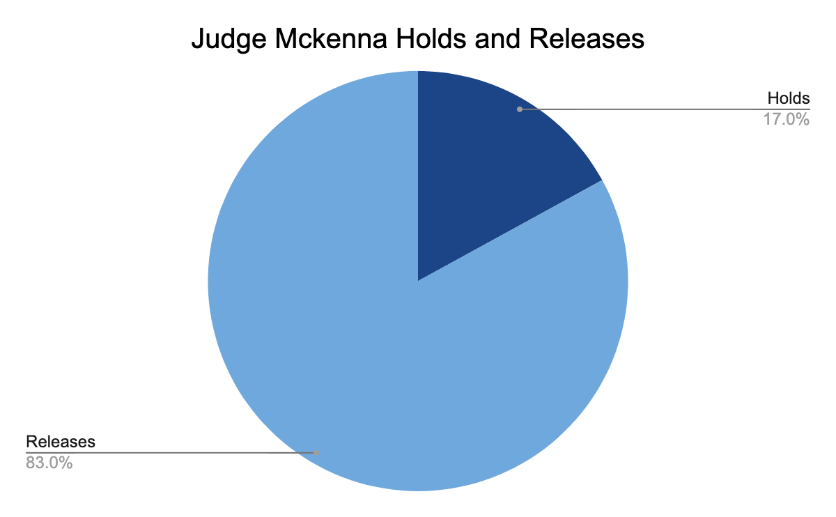 Judge McKenna held the lowest percentage of defendants, releasing 83 percent of all defendants and only holding around 17 percent. Judge McKenna heard 94 cases during the last two weeks of November.