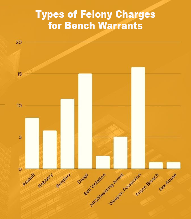 Drug charges make up more than 20 percent of the charges defendants were facing when they received the bench warrants.