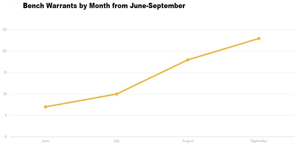 From June to the end of September, the number of bench warrants issued by judges increased from month-to-month. The number of bench warrants issued in September more than tripled the amount in June.