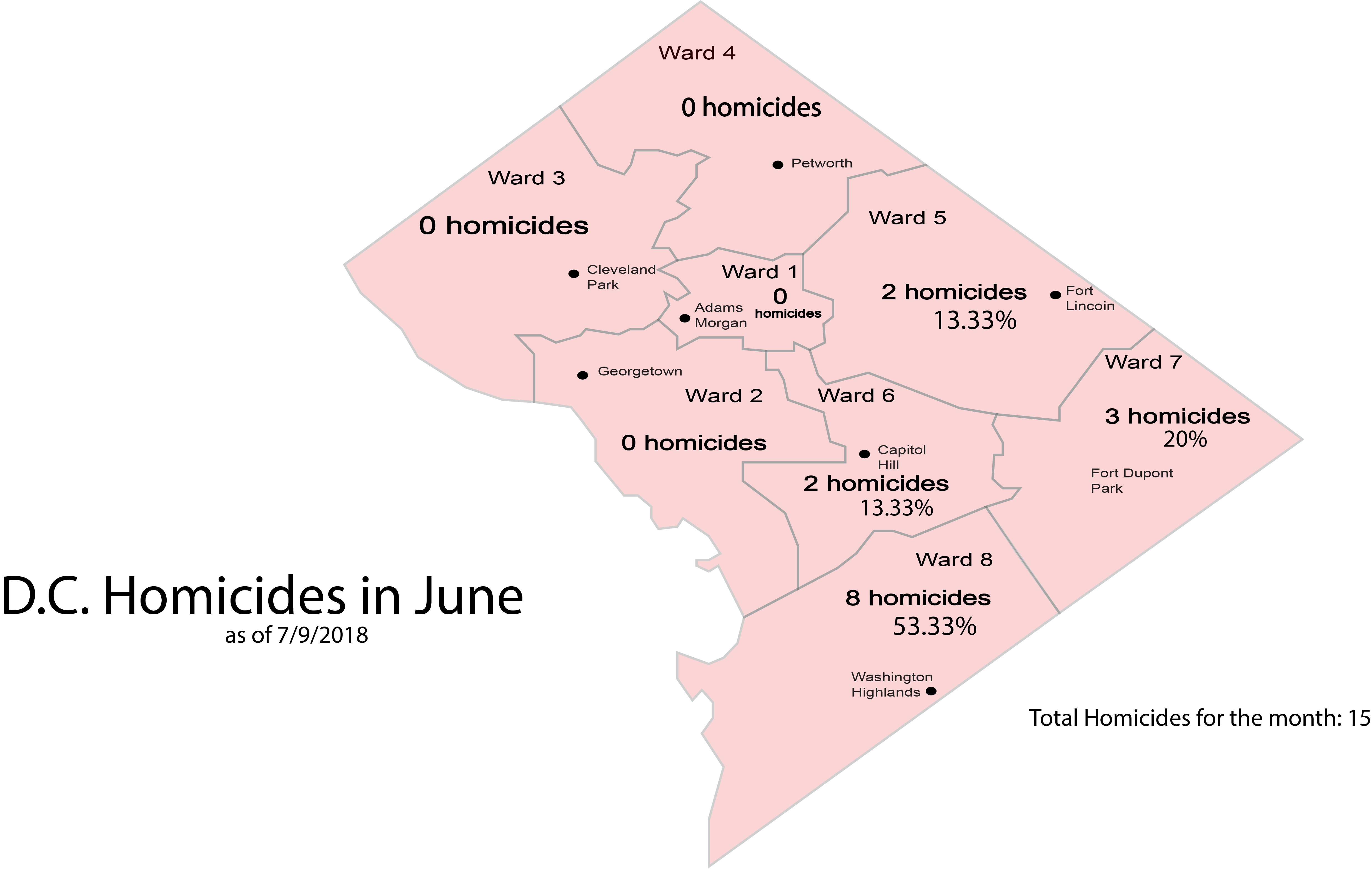 Even though the total number of homicides decreased from 19 homicides in May to 15 homicides in June, Ward 8 still ranked as Washington, DC’s most deadly area.