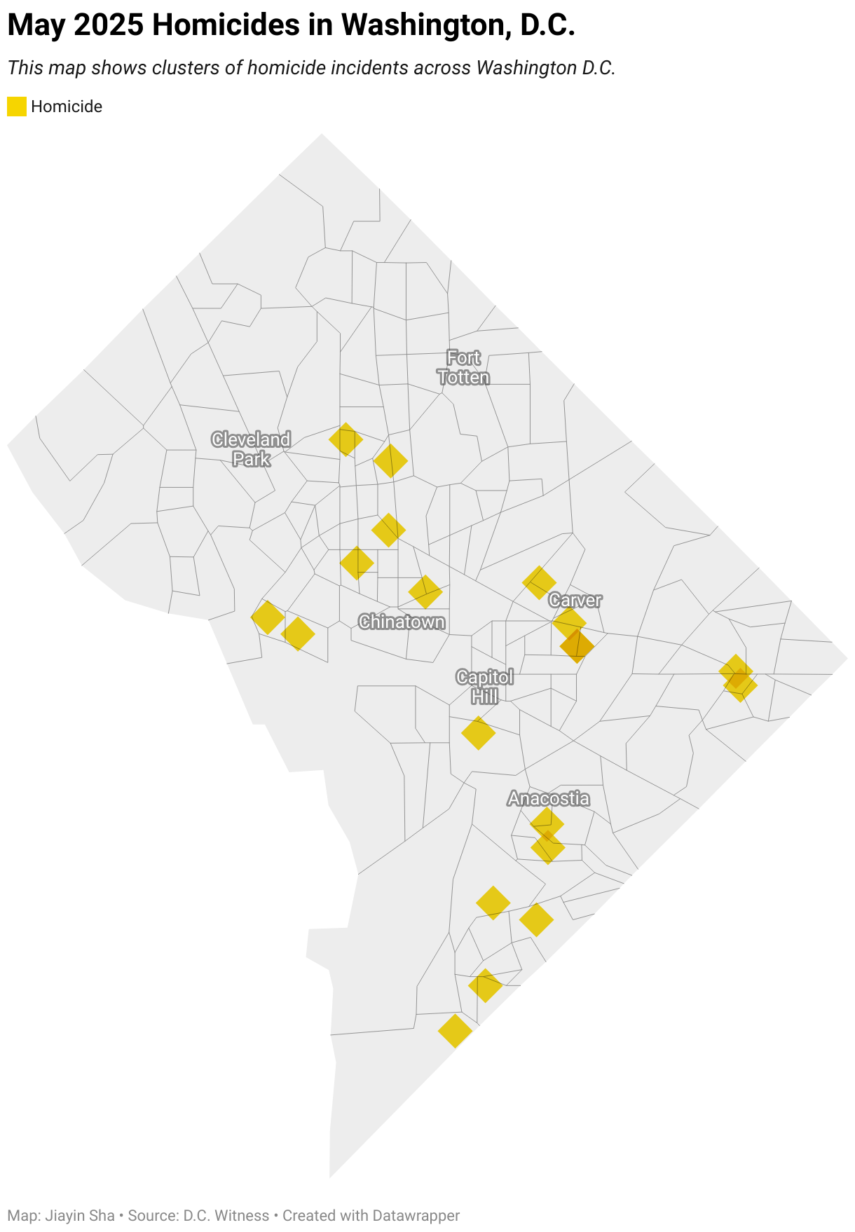 According to D.C. Witness data, the number of homicide incidents more than doubled from nine in April to 20 in May, accounting for 27 total victims.