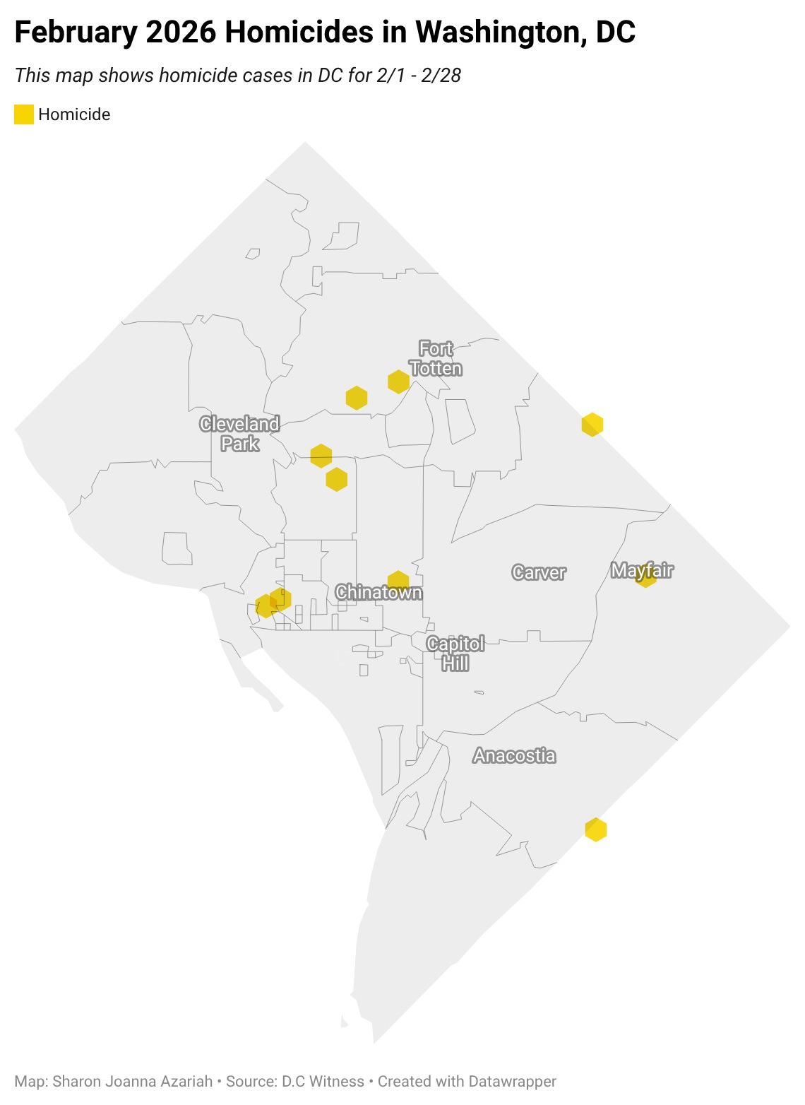 As of March 3, The Metropolitan Police Department (MPD) has identified three suspects among the 10 incidents. There were seven fatal shootings, one fatal stabbing, and two deaths resulting from a vehicle crash.