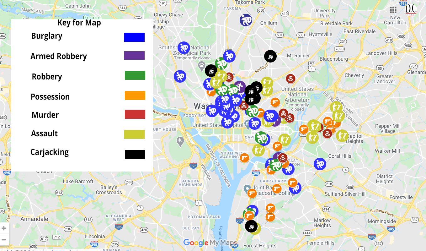 According to D.C. Witness data, 19 suspects were arrested for burglary. Police also arrested 22 suspects for various types of assaults, including assault with a dangerous weapon, sexual assaults, violent attacks, assault with the intent to kill, and assault on a police officer.