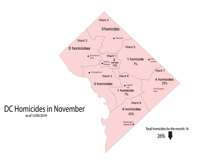Gun-related homicides mostly accounted for all of the homicides that occurred in Washington, DC during the month of November. A majority of the fatal shootings occurred in Southeast, DC, according to D.C. Witness data.