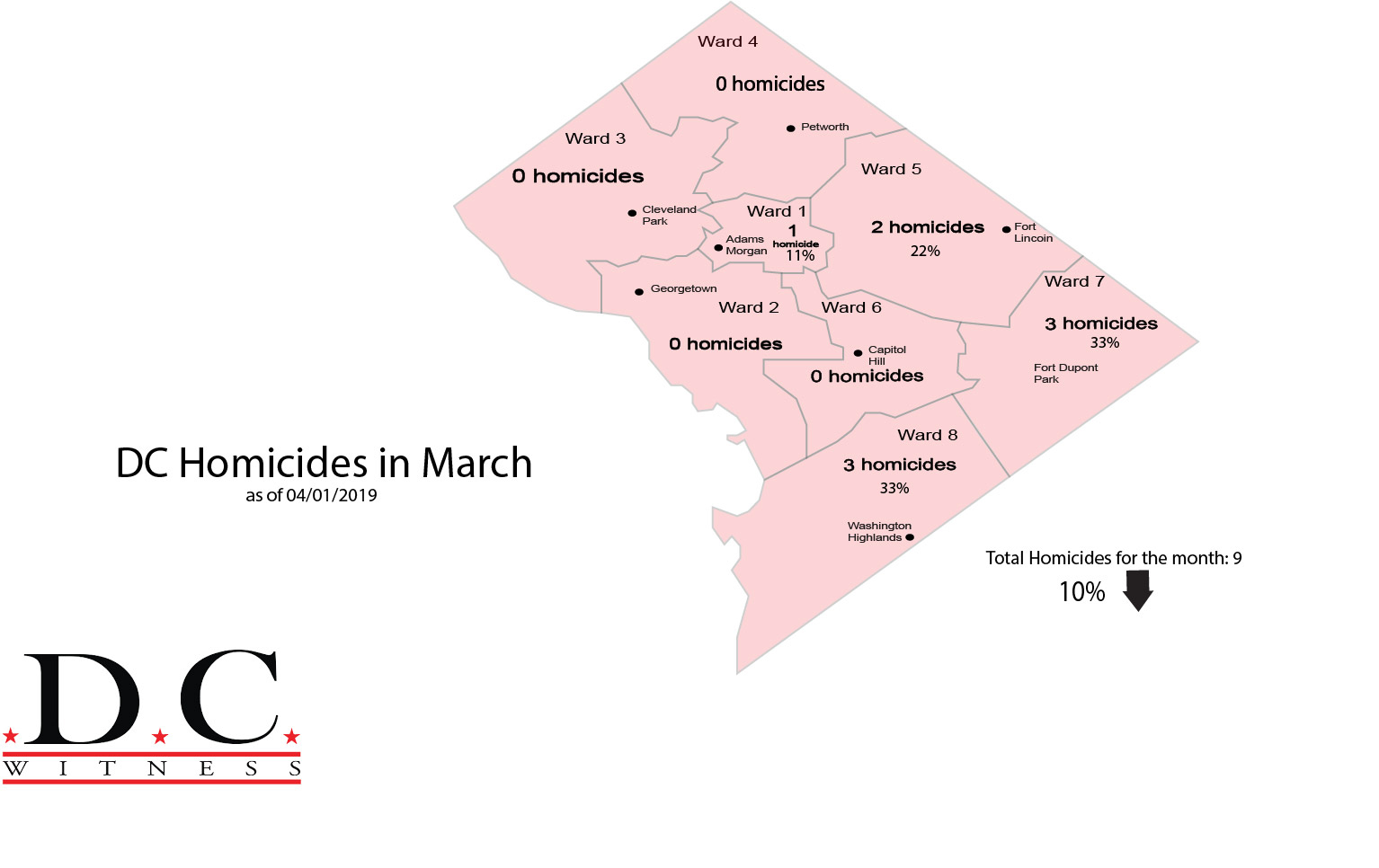 According to D.C. Witness data, there have been nine homicides in March, a 10 percent decline from the 10 homicides in February.