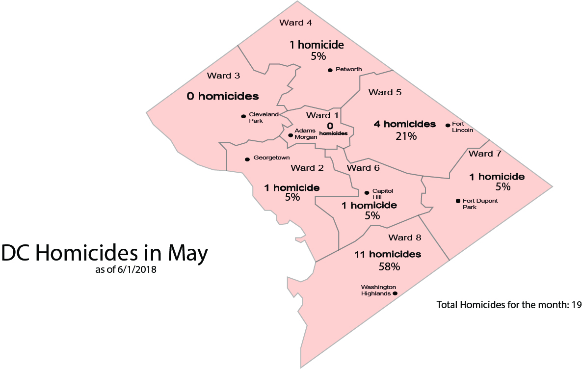 One of the May homicides was a police-involved shooting by an off-duty officer in Ward 5. The May 9 shooting allegedly stemmed from a dispute between the officer and the decedent, D’Quan Young.