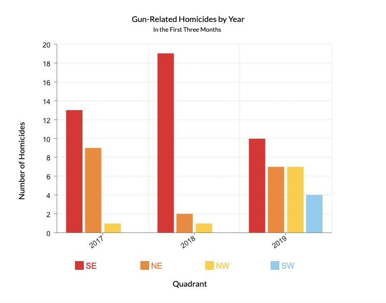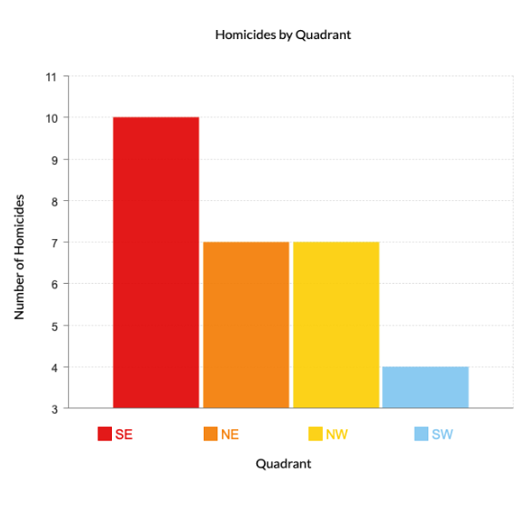 In comparison to previous years, the Southeast quadrant has consistently had the highest number of gun-related homicides. However, the frequency of gun-related homicides in Southeast DC has dropped over the last two years.