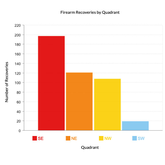 In total, there were 197 firearms recovered in Southeast DC, 121 from Northeast, 108 from Northwest and 19 from Southwest. Three firearms did not have a reported address.