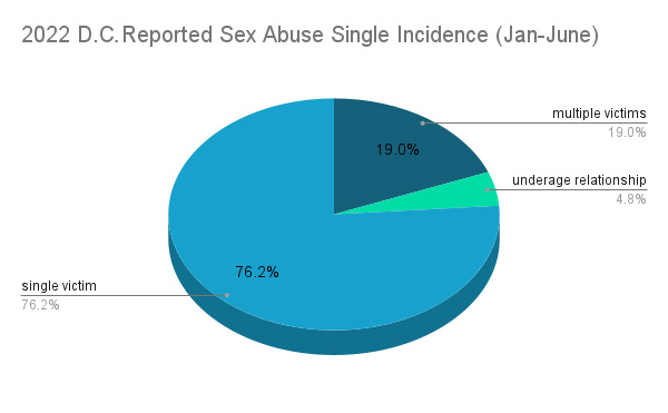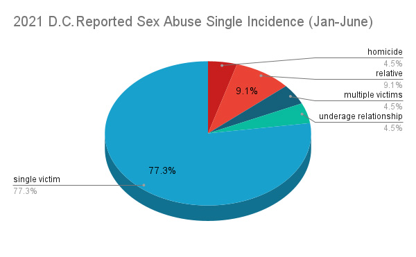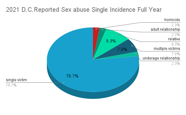 Editor’s note: Given the nature of sex abuse incidence, the process of the events that occurred, to reporting the incident, to when the defendant is seen in the courts; the case year may differ from when the incident has occurred. A limitation is that some cases are closed to the public from the D.C superior court. Also, according to the Rape, Abuse & Incest National Network (RAINN), only 310 out of every 1000 sexual assaults are reported to police. Therefore, meaning 2 out of 3 sexual assaults go unreported (RAINN, 2021).