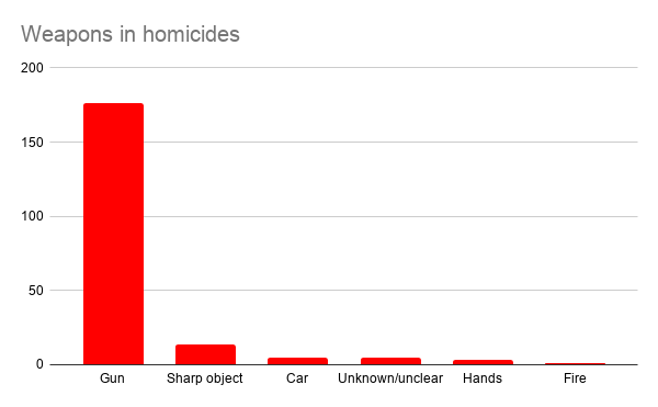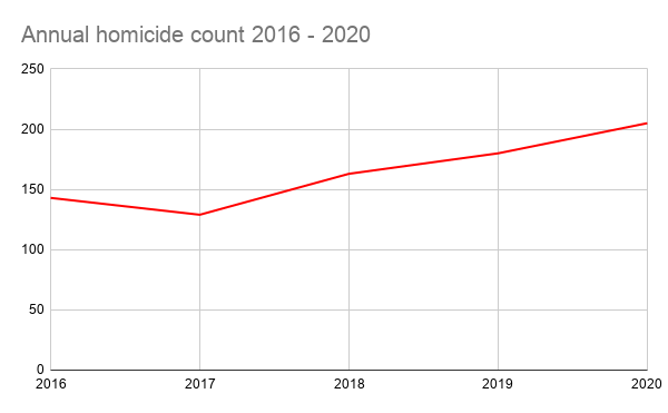 The homicide count for 2020 is also higher than it was in 2018, 2017 or 2016.