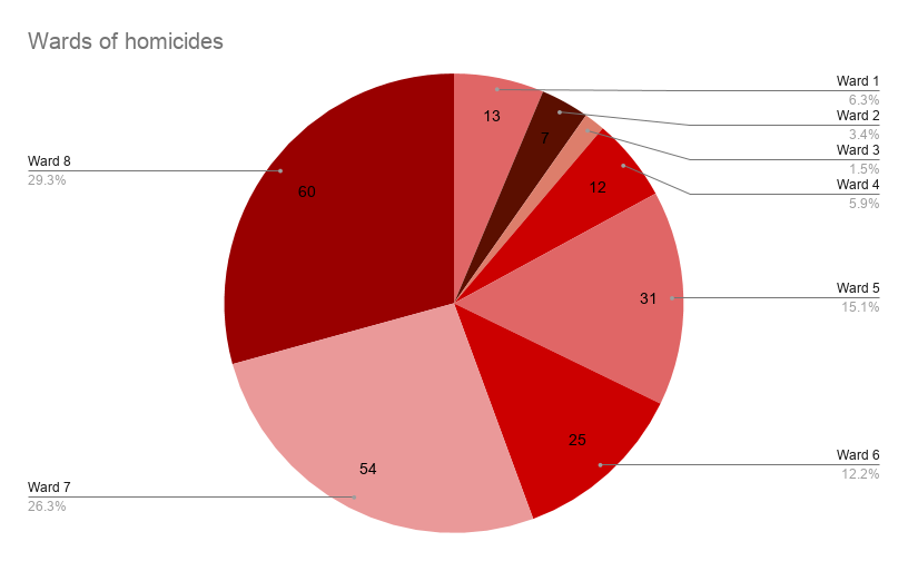 Similar to 2019, Ward 8 had the most homicides. In 2020, the ward had 60 homicides, about 29 percent of the District’s total. In 2019, there were 71 homicides, about 35 percent of the District’s total.